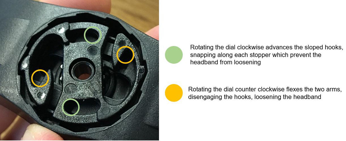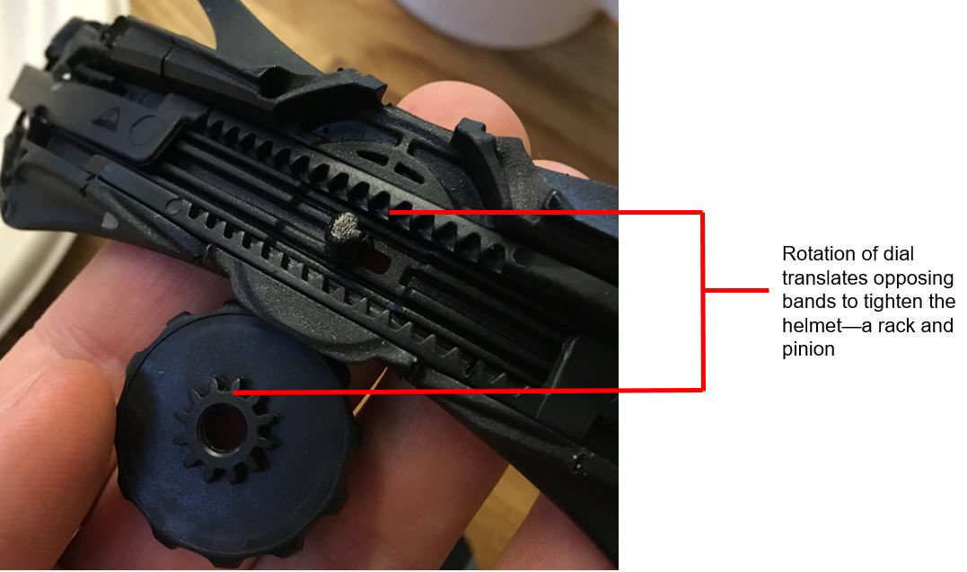 Interested in how a bike helmet is able to fit various sized heads, I decided to take apart this module of a bike helmet. Inside is a clever design that allows the user to easily tighten and loosen the helmet on their head.