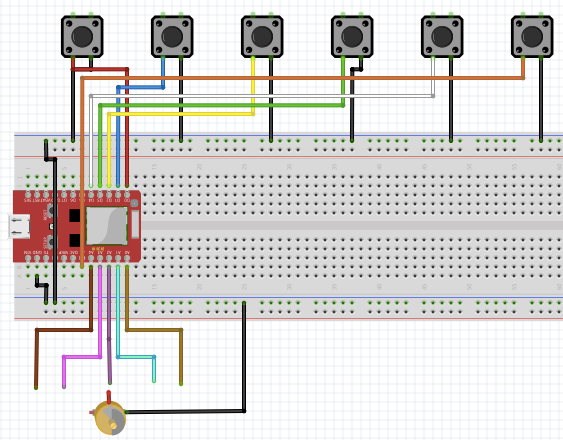 Fritzing diagrams of 6 tact switches and 5 dial states wired to the microcontroller.